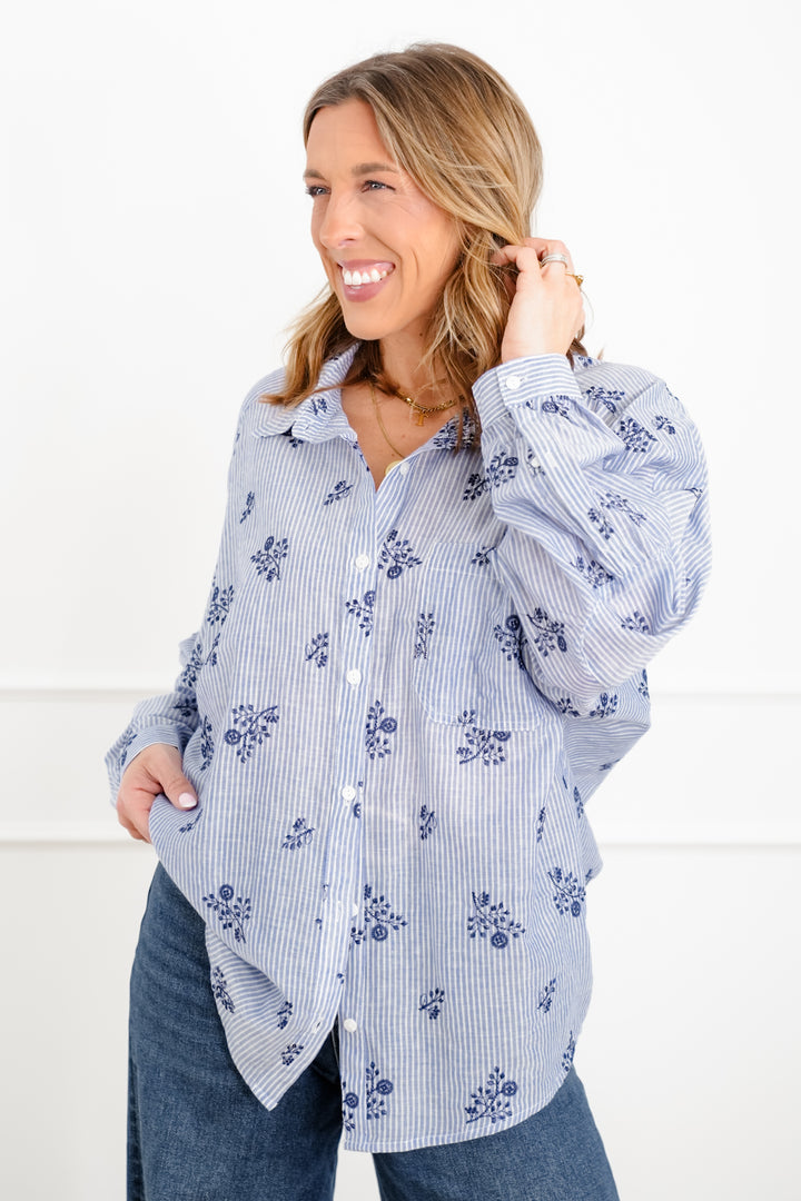 Plus/Reg Floral Stripe Long Sleeve Button Down Top
