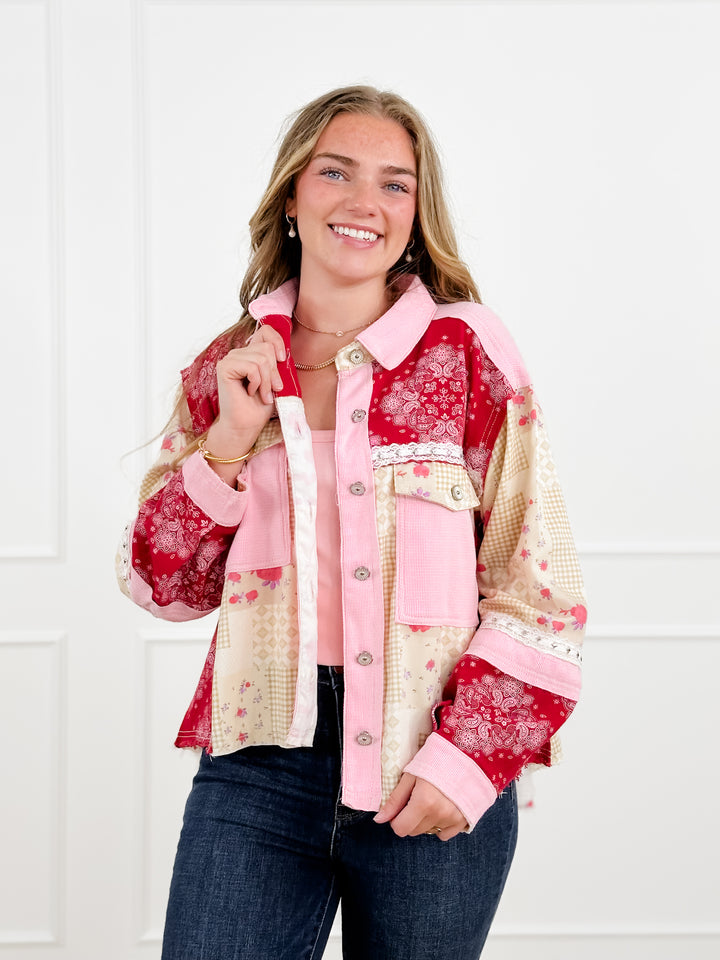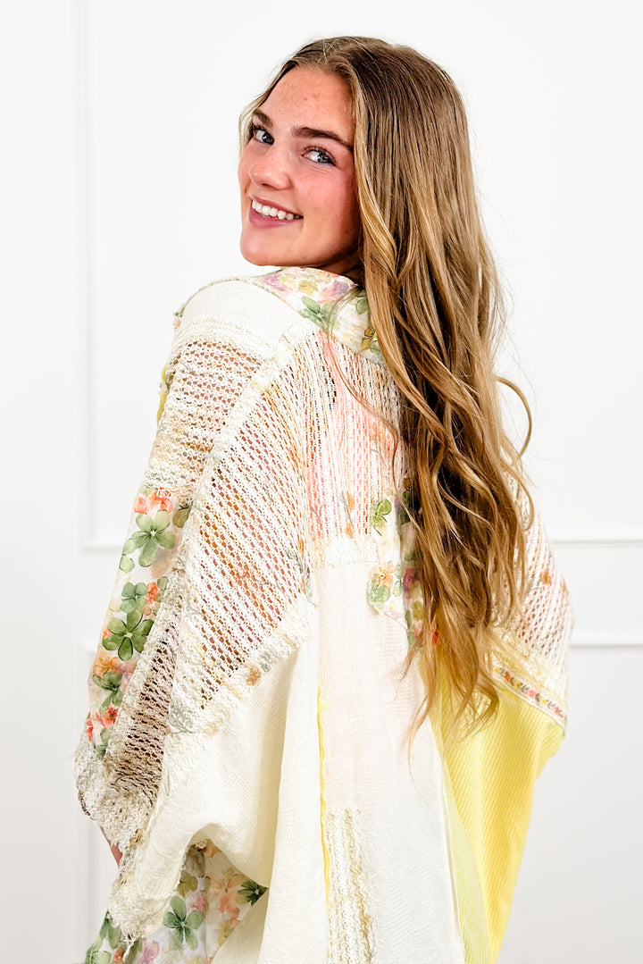 POL Textured 3/4 Sleeve Button Up Top with Flowers