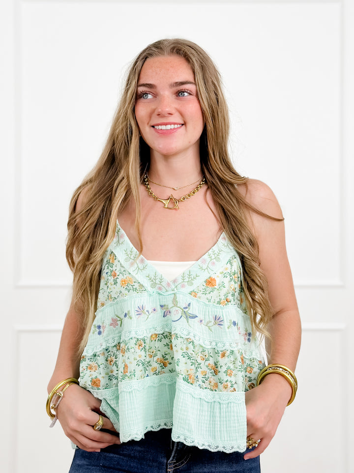 Blue Floral Sleeveless Midi Dress with Ric Rac Trim Detail