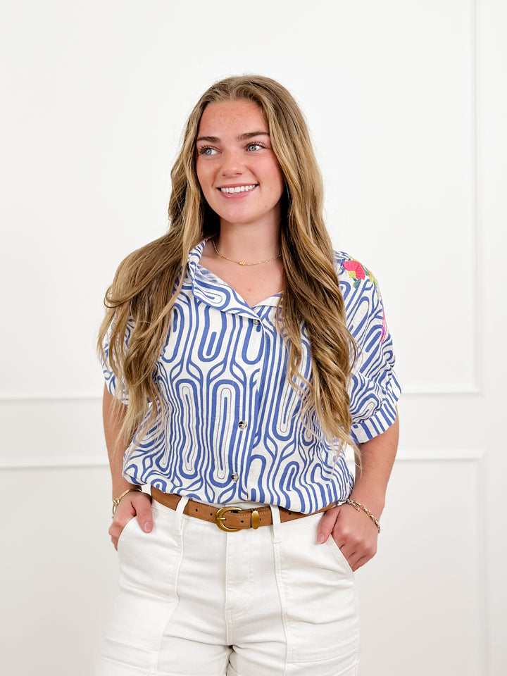Plus/Reg Geometric Print Button Down Top with Embroidery Detail
