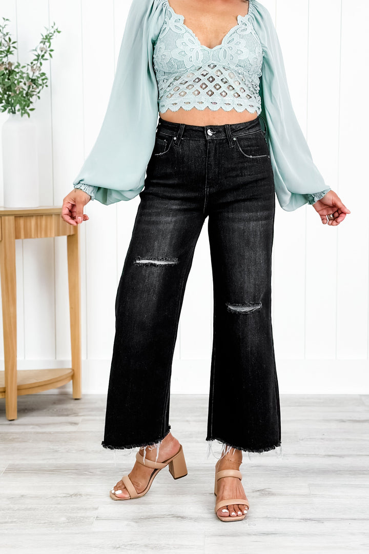 Risen High Rise Black Frayed Ankle Wide Leg Jeans