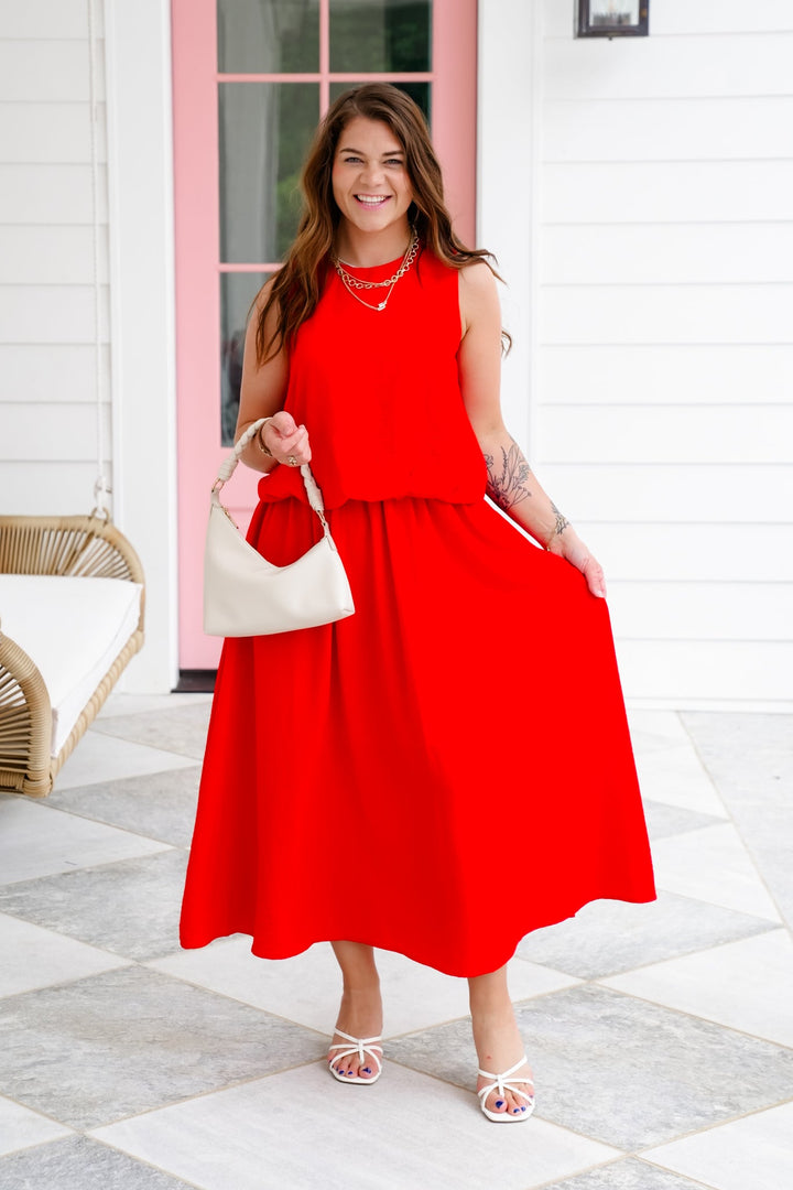 Red Woven Elastic Waist Midi Skirt with Side Pockets