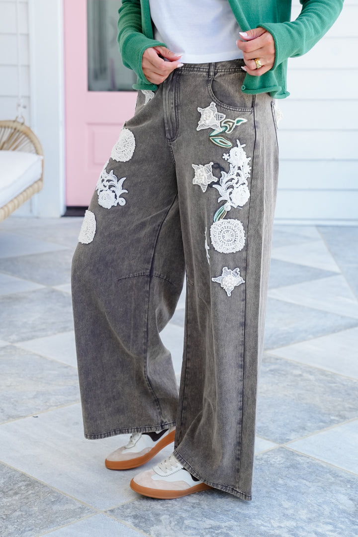 Coral Elastic Waist Jogger Pants with Floral Embroidery Detail