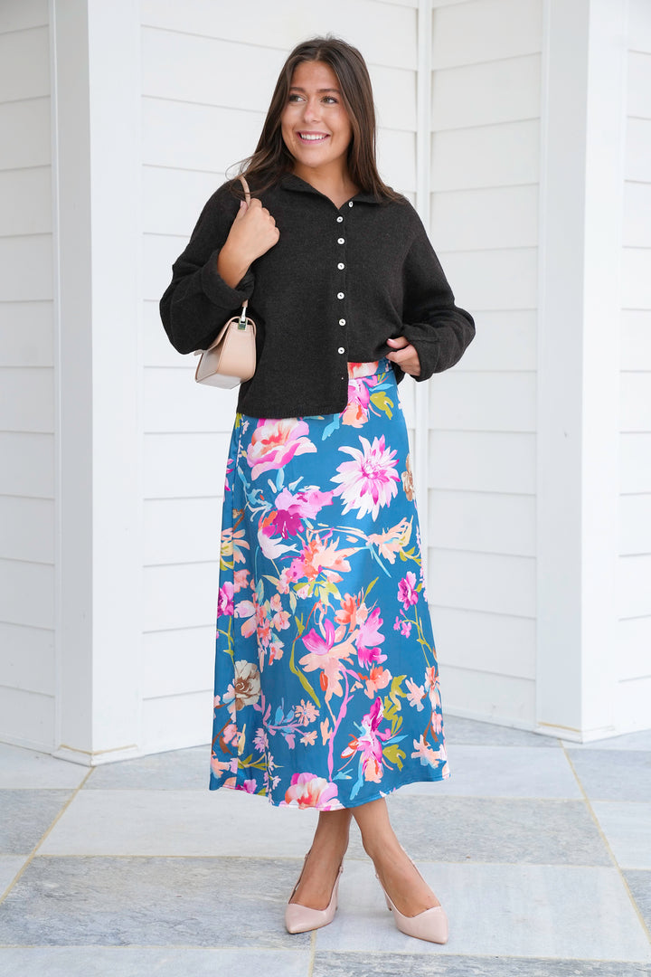 Plus/Reg Floral Satin Elastic Waist Midi Skirt