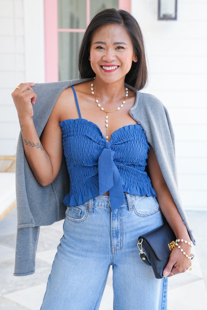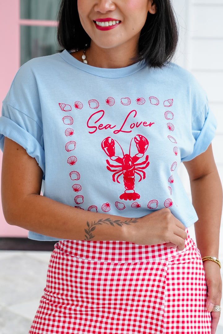 Blue Short Sleeve "Sea Lover" Cropped Graphic Top
