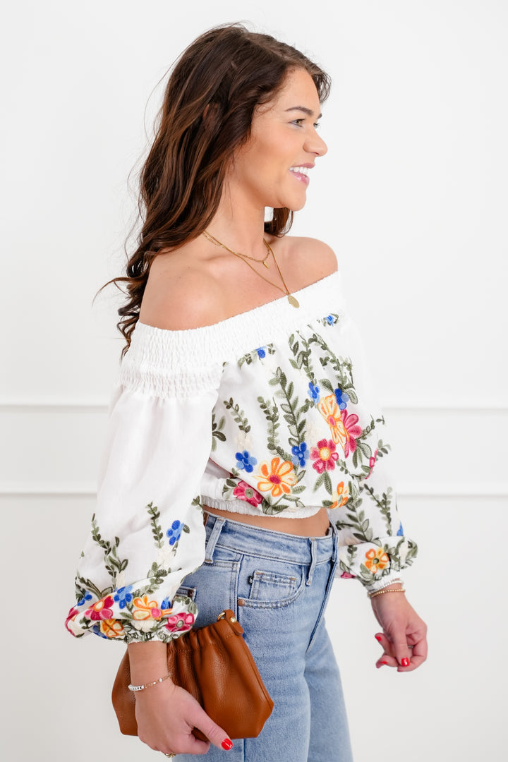 Floral Embroidered Long Sleeve Off Shoulder Crop Top