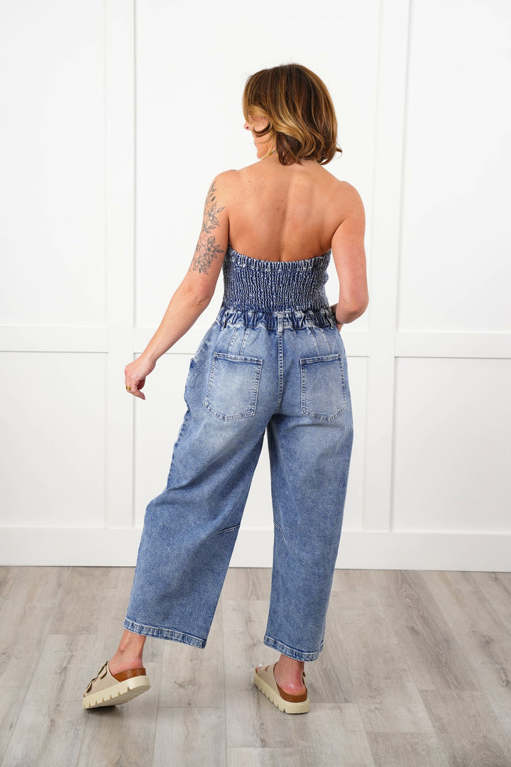 Mineral Wash Denim Sleeveless Overalls with Smocking Detail