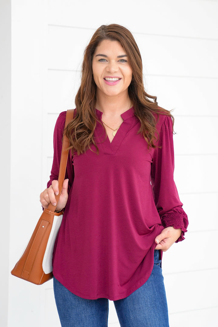 Door Buster! Plus/Reg Solid Long Sleeve Split Neck Tunic Top