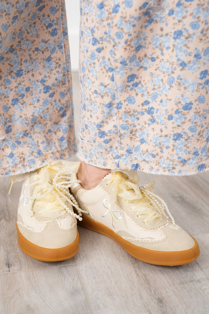 Pearl and Bow Detailing Sneakers with Lace Accents