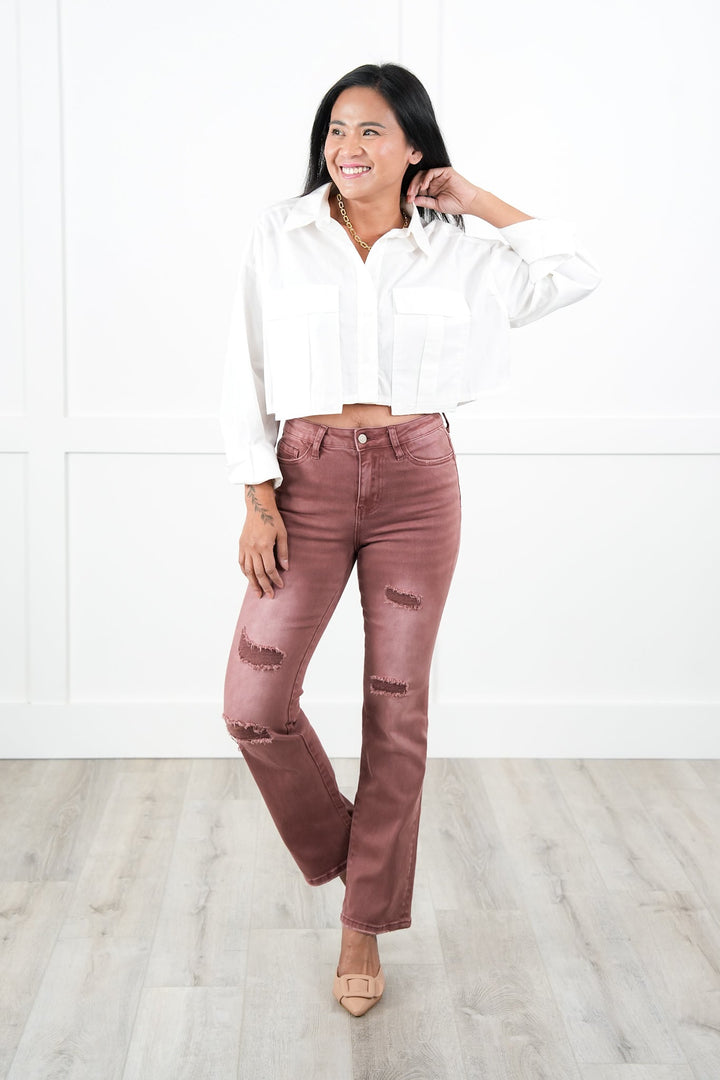 Vervet High Rise Dark Mauve Distressed Bootcut Jeans