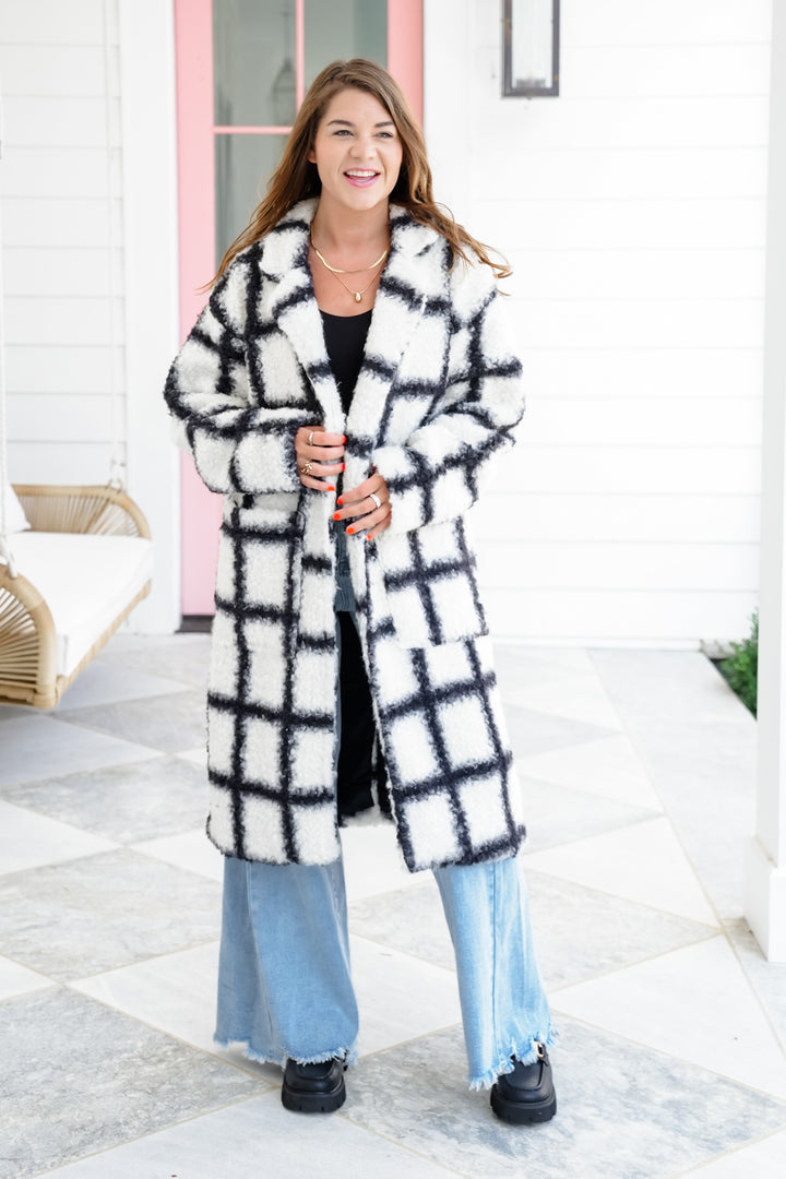 Plus/Reg Plaid Long Sleeve Open Front Fuzzy Coat