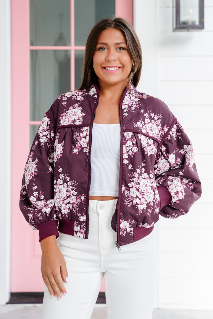 Quilted Floral Long Sleeve Zip Up Bomber Jacket