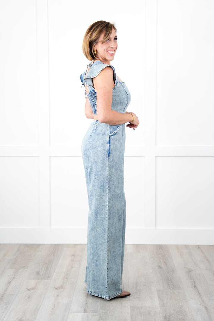 Plus/Reg Denim Sleeveless Jumpsuit with Smocked Back and Peek-a-Boo Detail