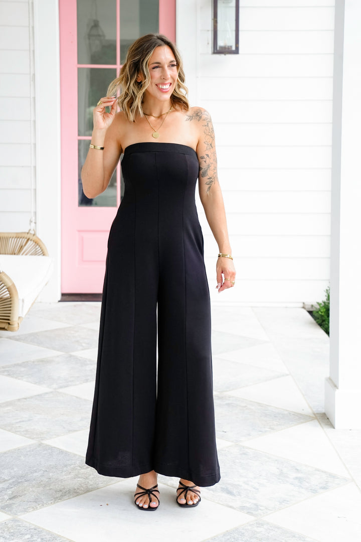 Navy Polka Dot Strapless Wide Leg Jumpsuit