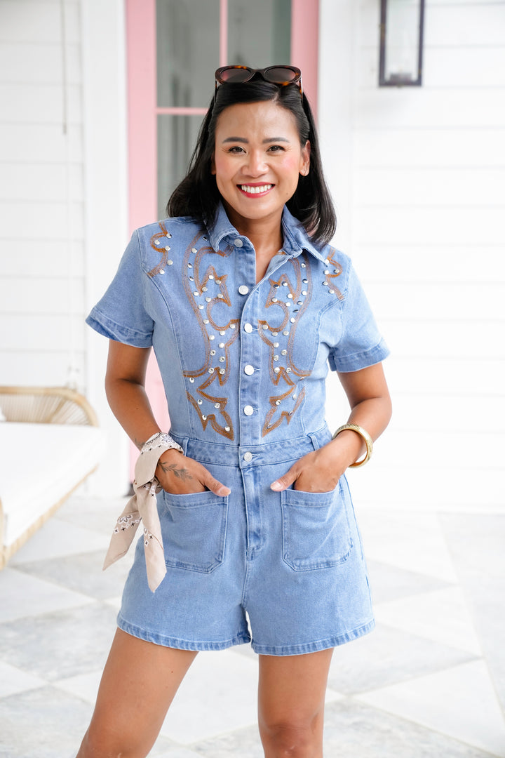 Plus/Reg Wildflower Judy Blue Denim Short Sleeve High Waist Romper