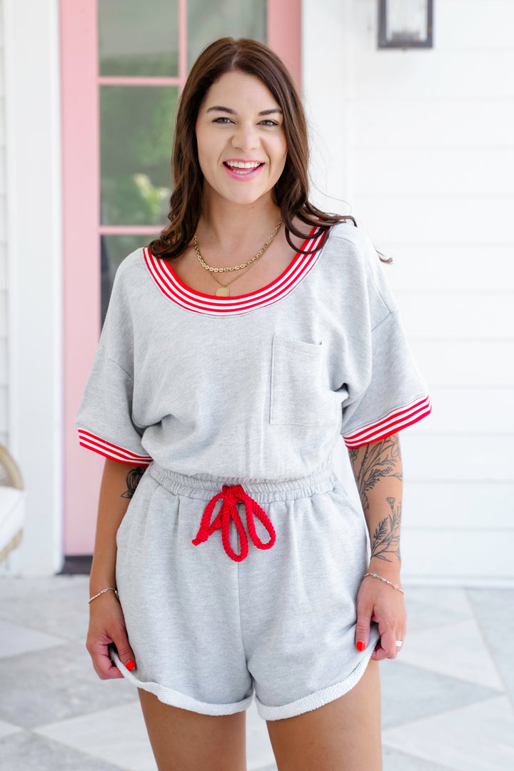 Short Sleeve Terry Romper with Stripe Trim Detail