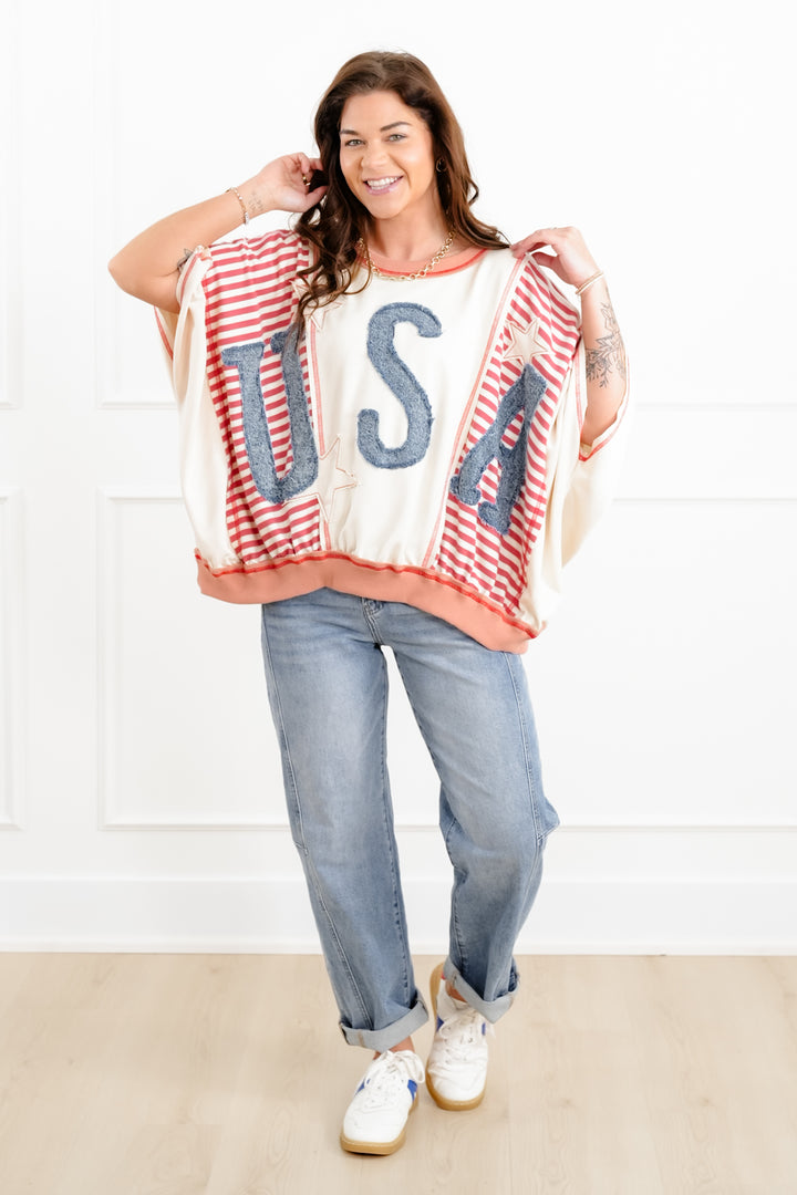 Color Block and Stripe 3/4 Sleeve Top with Denim "USA" Patchwork Detail