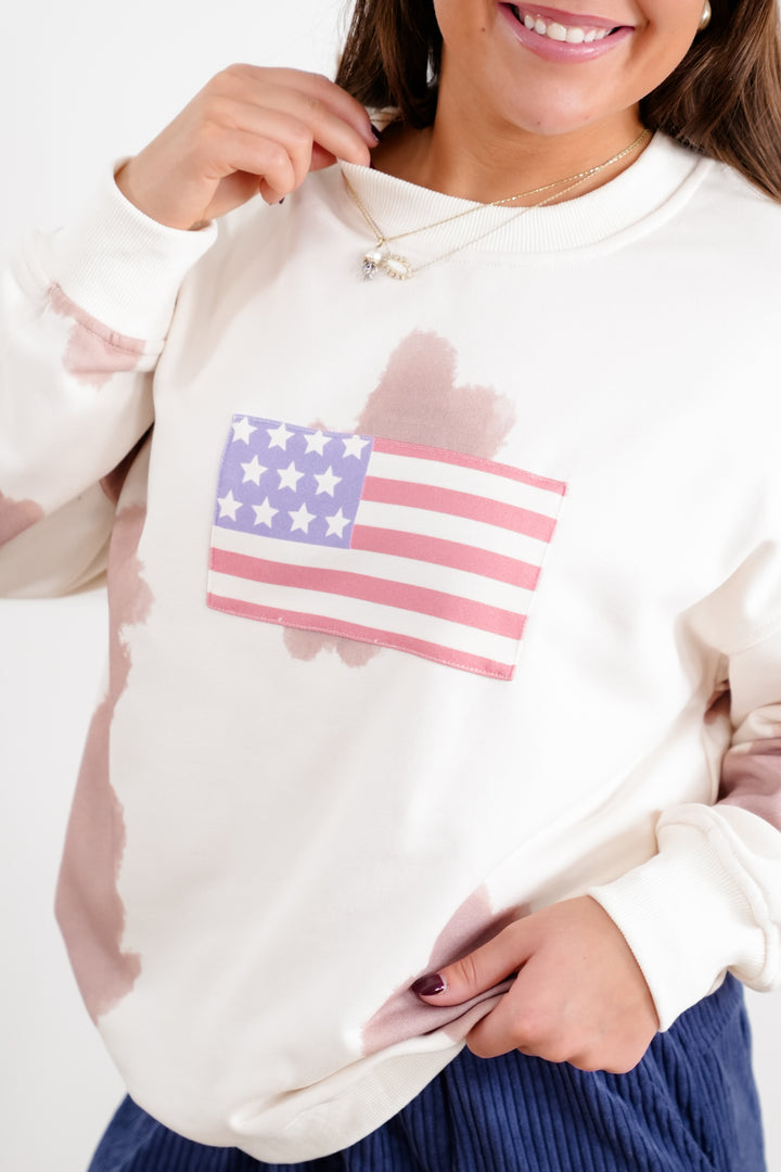 Cow Print Long Sleeve Sweatshirt with American Flag Detail