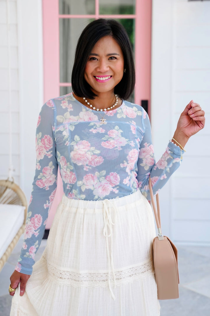 Floral Mesh Long Sleeve with Reverse Seam Detail