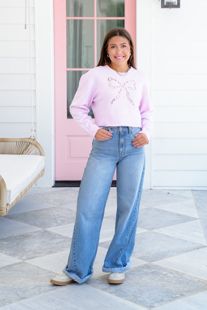 Long Sleeve Crop Sweater with Lace Bow Detail