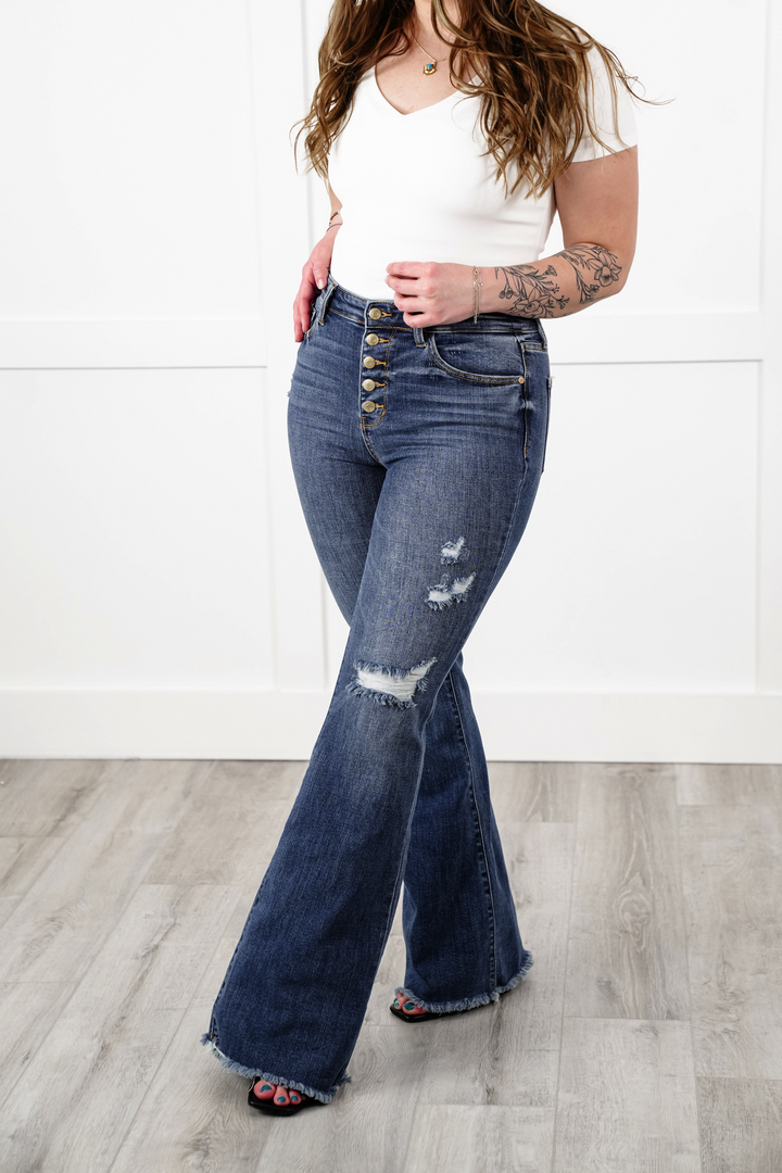 Restock! Judy Blue Date Night Dark Wash Button Fly Distressed Trouser Flare Jeans