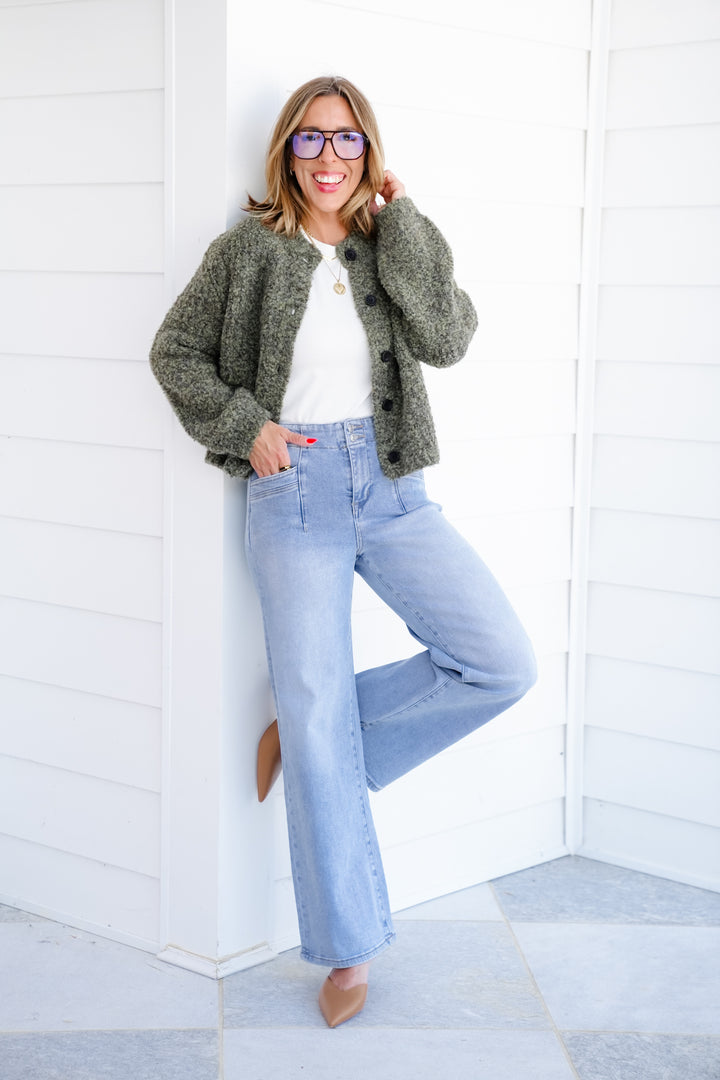 Mica High Rise Green Double Waistband Wide Leg Jeans