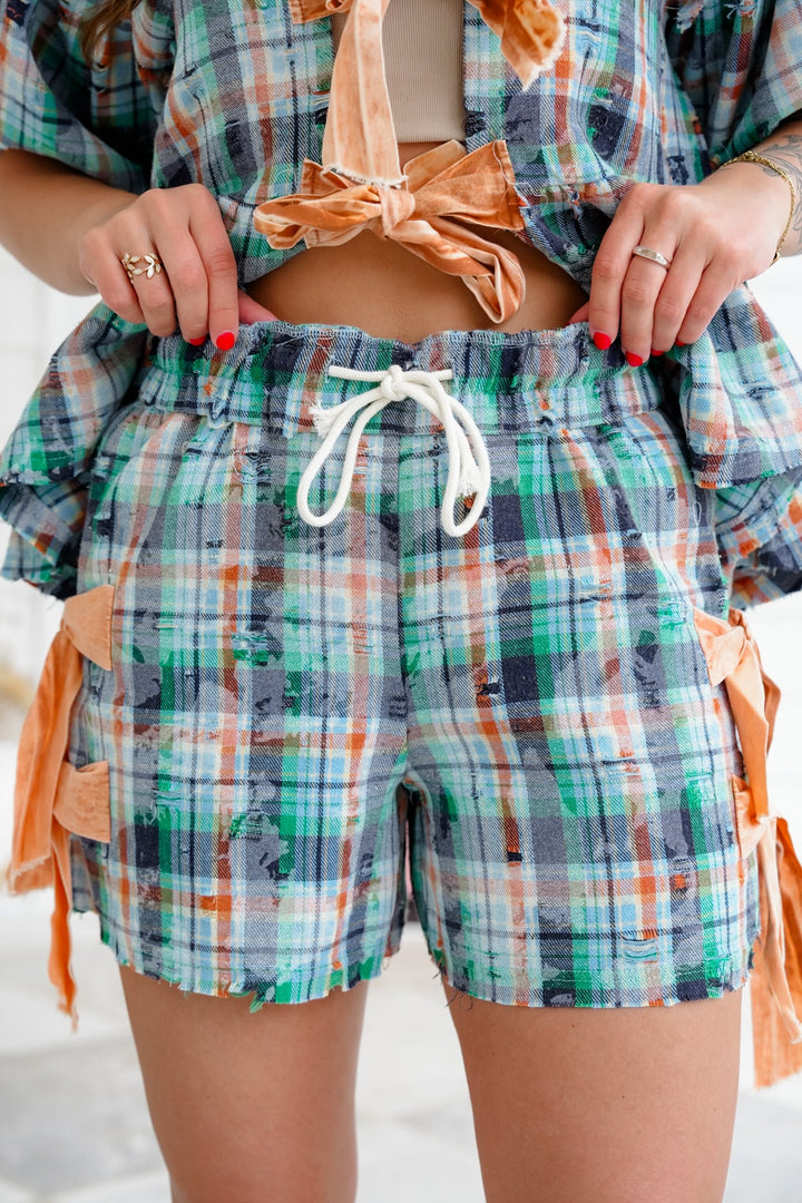 Distressed Mineral Washed Plaid Short Sleeve Bow Tie Top with Shorts Set
