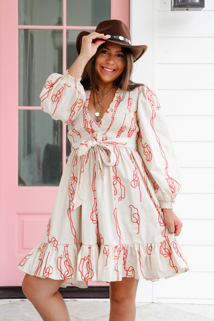 Puff Sleeve Smocked Bodice Mini Dress With Embroidered Detail