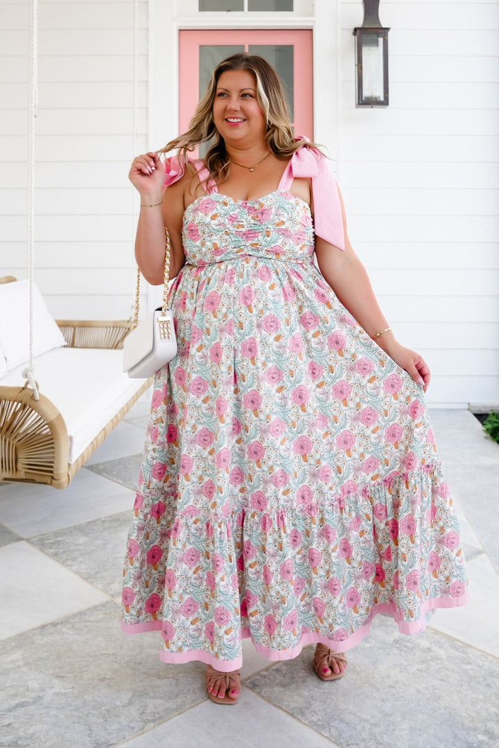 Rose Floral Sleeveless Maxi Dress with Ribbon Tie Straps