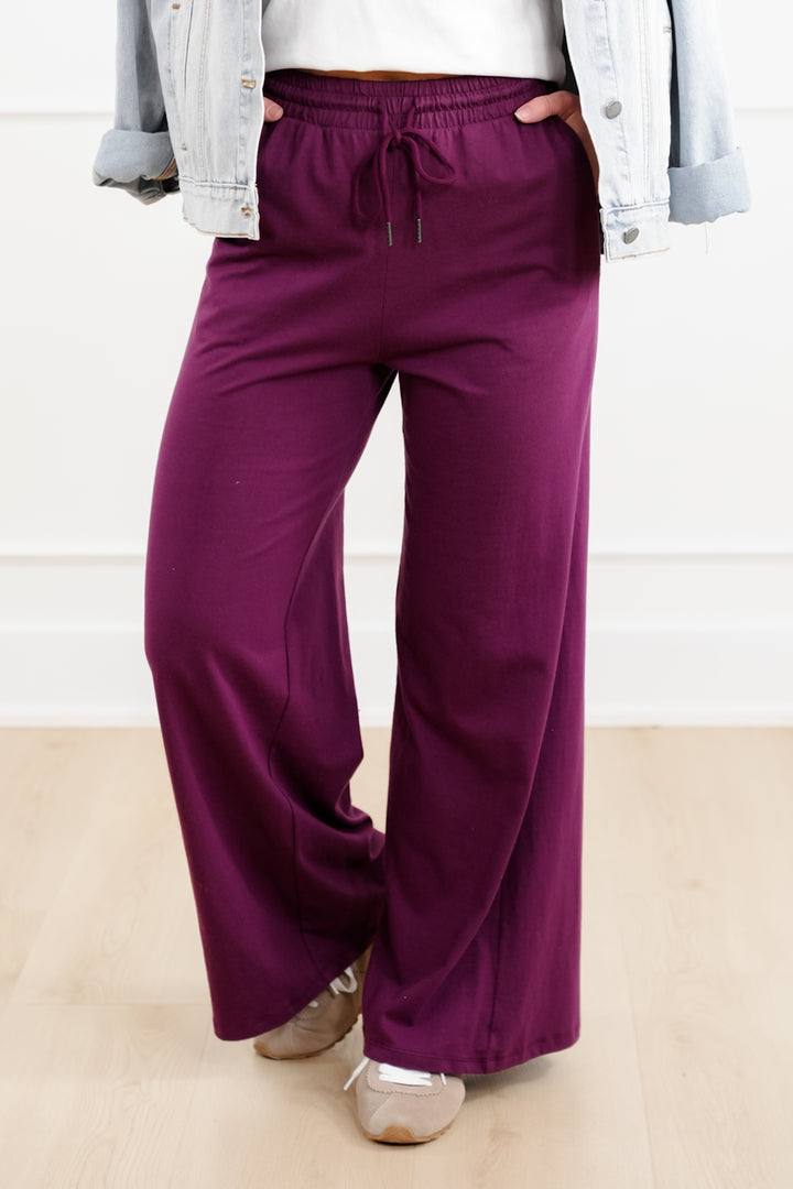 Solid Cotton Elastic Waist Wide Leg Pants