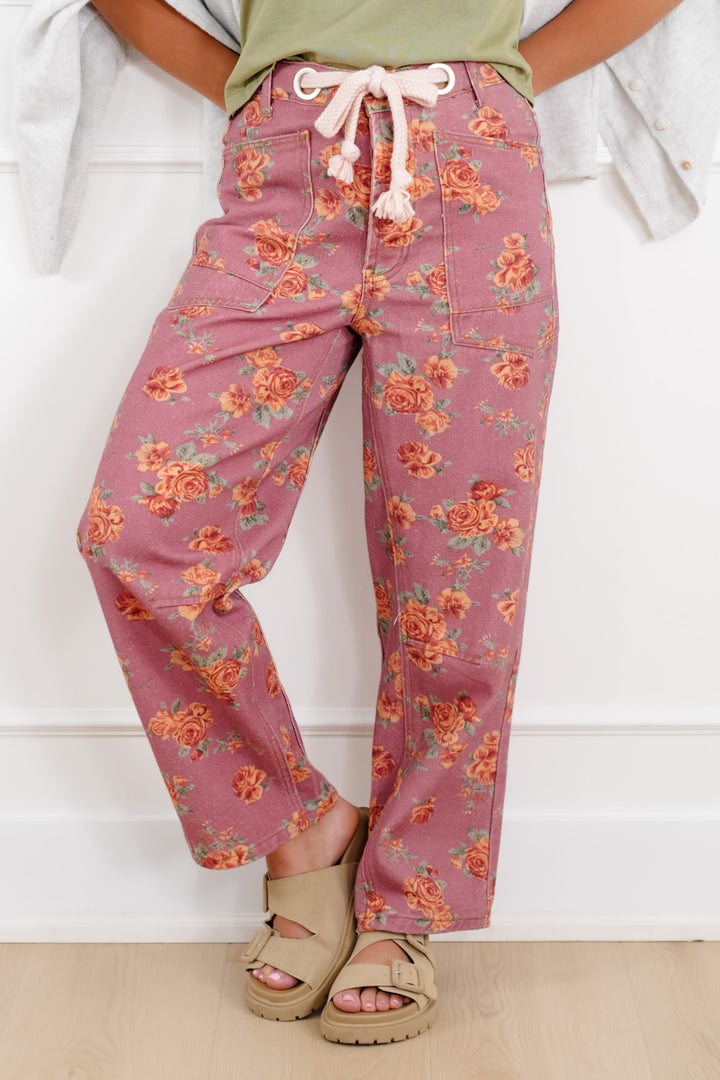 Floral Print Barrel Jeans with Back Buckle Detail