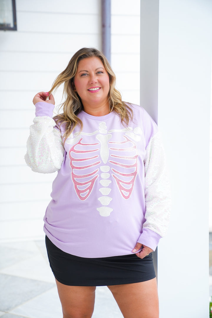 Plus/Reg Glitter Skeleton Long Sleeve Top with Sequins