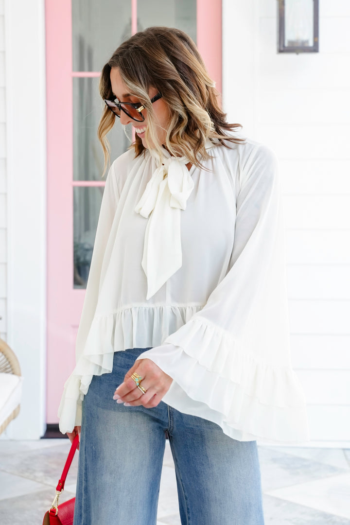 Plus/Reg Long Bell Sleeve Ruffle Blouse