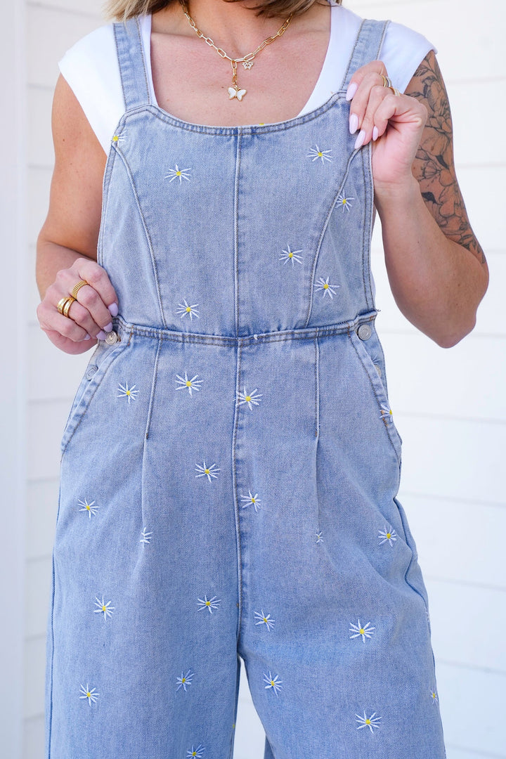 Plus/Reg Denim Overalls with Daisy Embroidered Detail