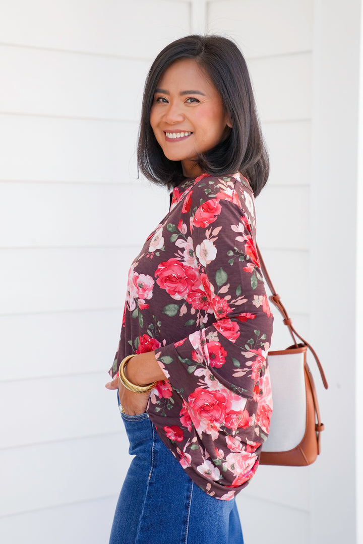 Plus/Reg Chocolate Floral Long Bell Sleeve Tunic Top