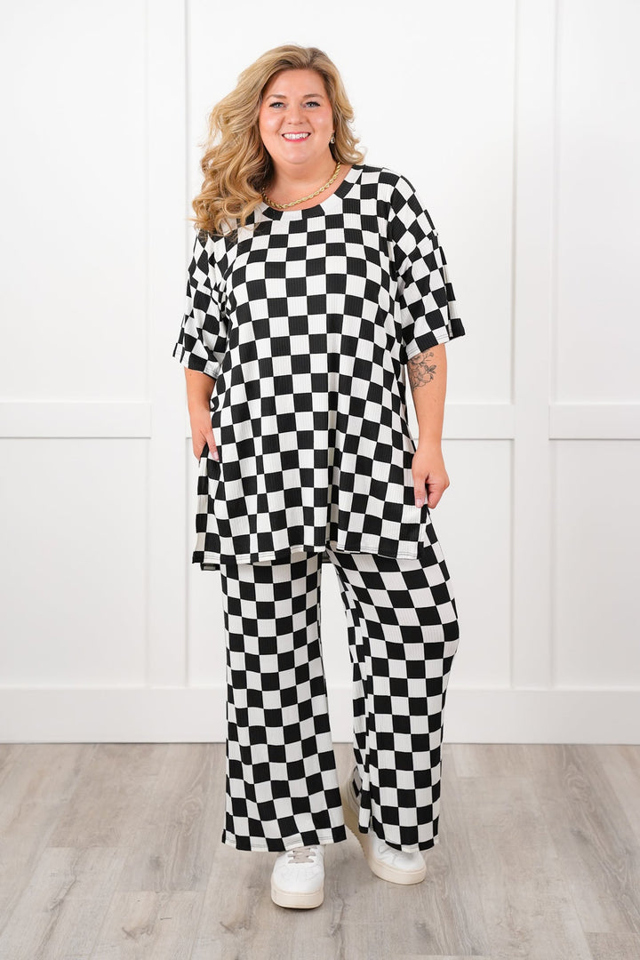 Plus/Reg Ribbed Checkered Short Sleeve Tunic Top and Pants Set