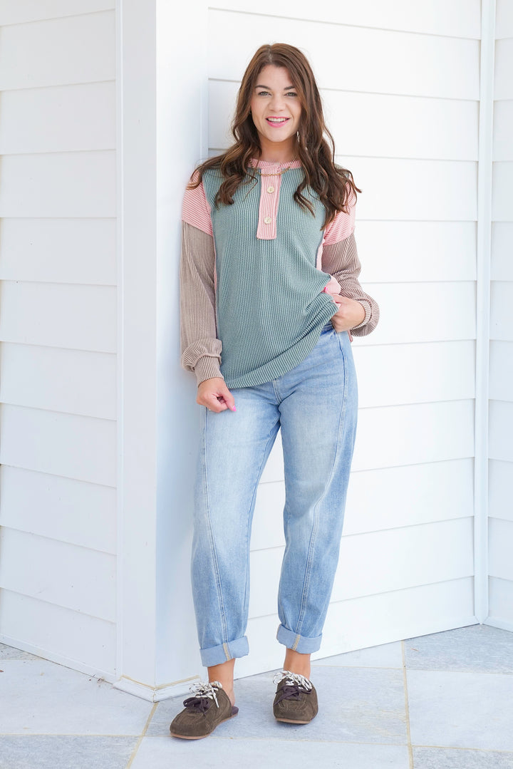 Plus/Reg Urban Ribbed Color Block Button Up Top