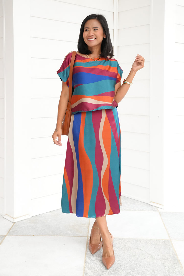 Plus/Reg Satin Vertical Wavy Stripe Midi Skirt
