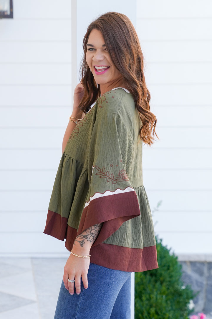 Plus/Reg Color Block 3/4 Sleeve V Neck Peasant Blouse