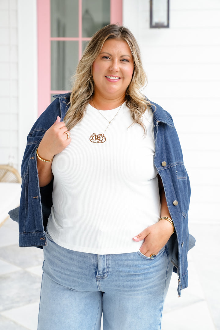 Plus/Reg Short Sleeve Top with Embroidered Horseshoe Detail