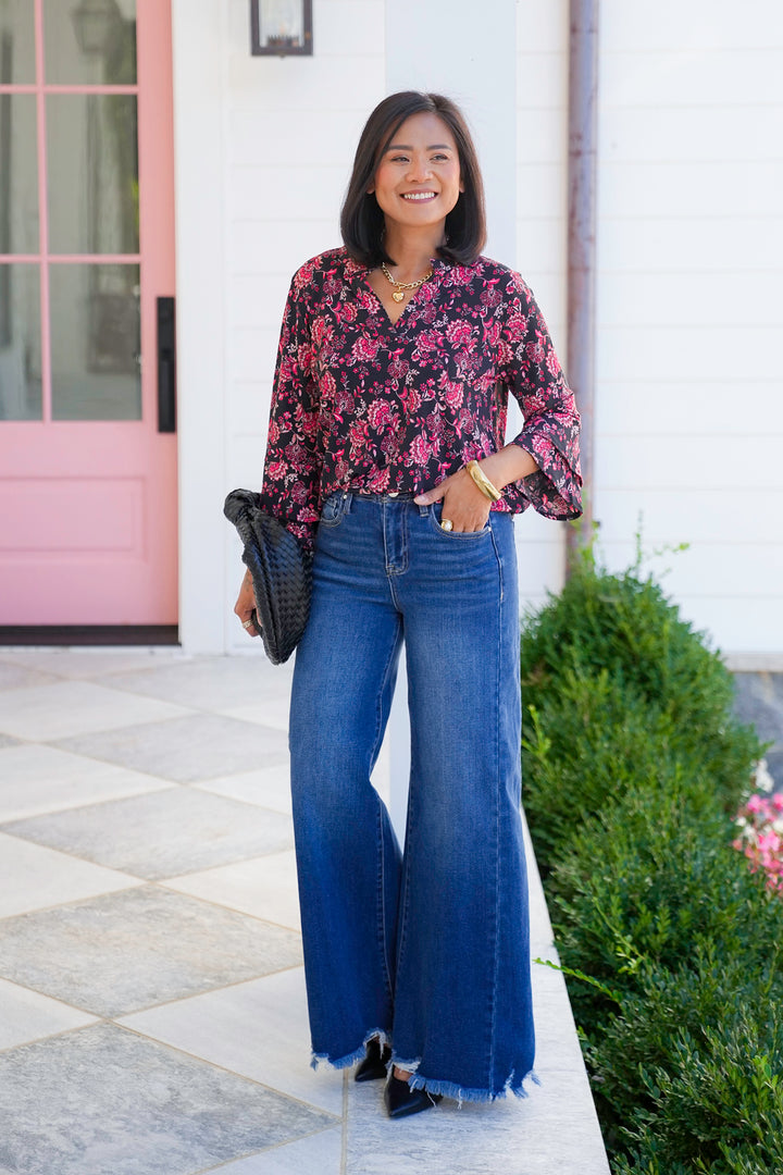 Plus/Reg Black Floral 3/4 Bell Sleeve Tunic Top