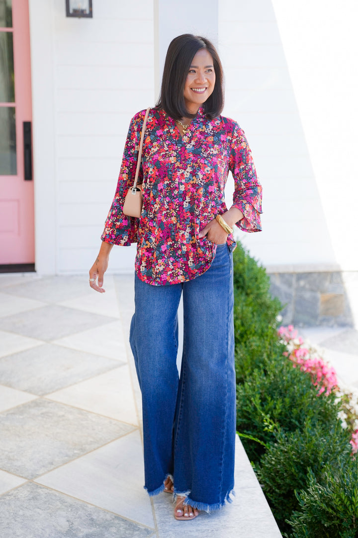 Plus/Reg Floral Print 3/4 Bell Sleeve Tunic Top