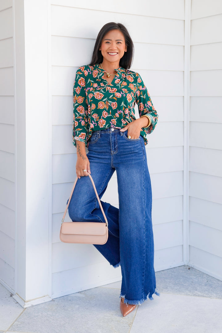 Plus/Reg Olive Floral Long Bell Sleeve Tunic Top