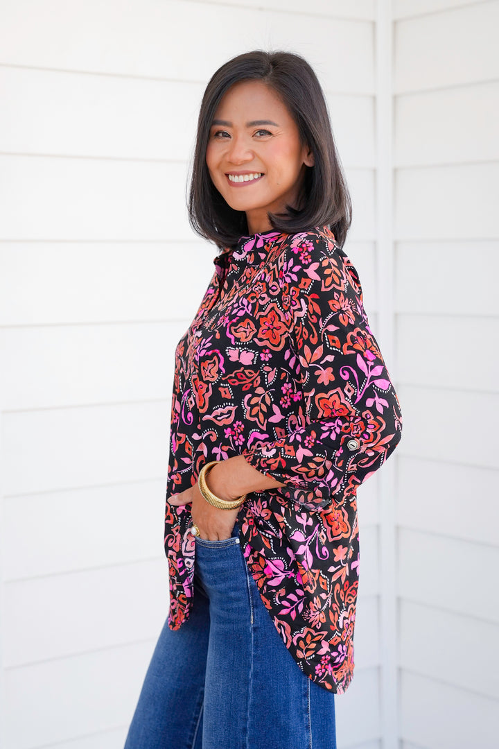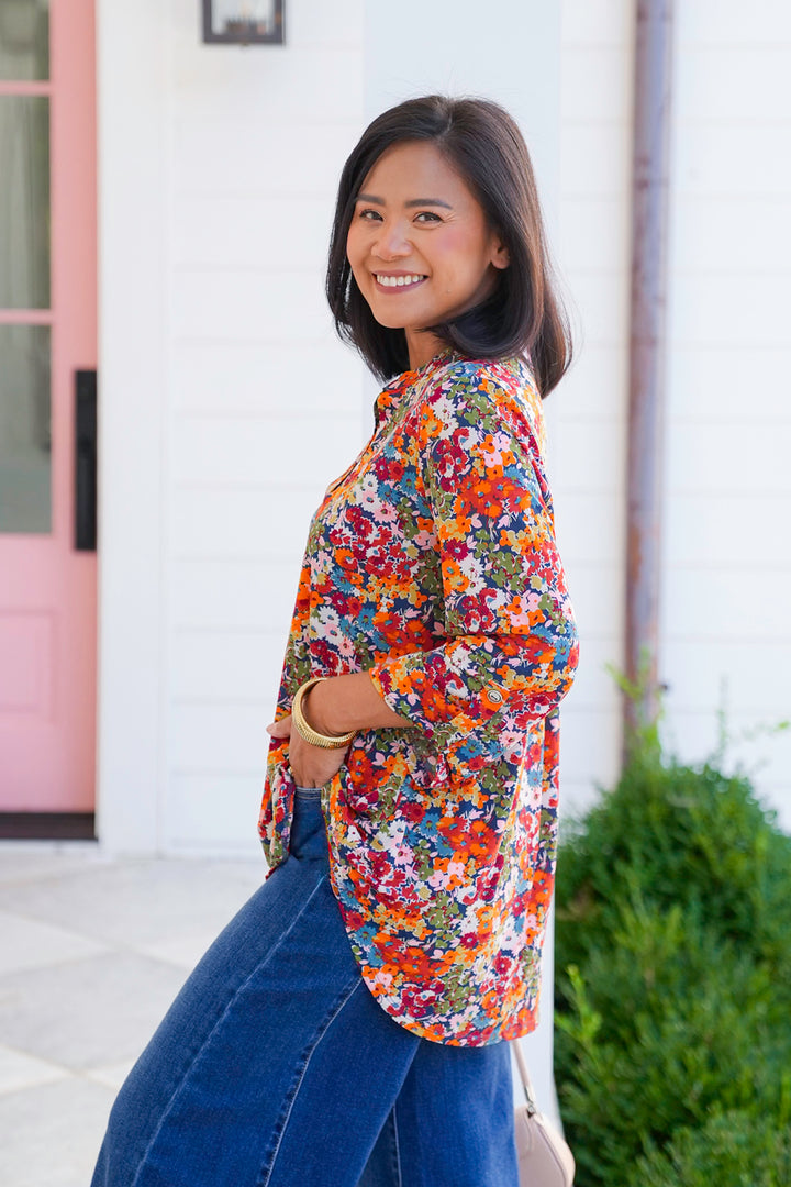Plus/Reg Floral 3/4 Button Tab Sleeve Tunic Top