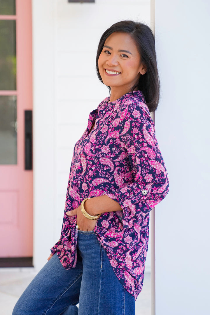Plus/Reg Navy and Pink Paisley 3/4 Sleeve Tunic Top
