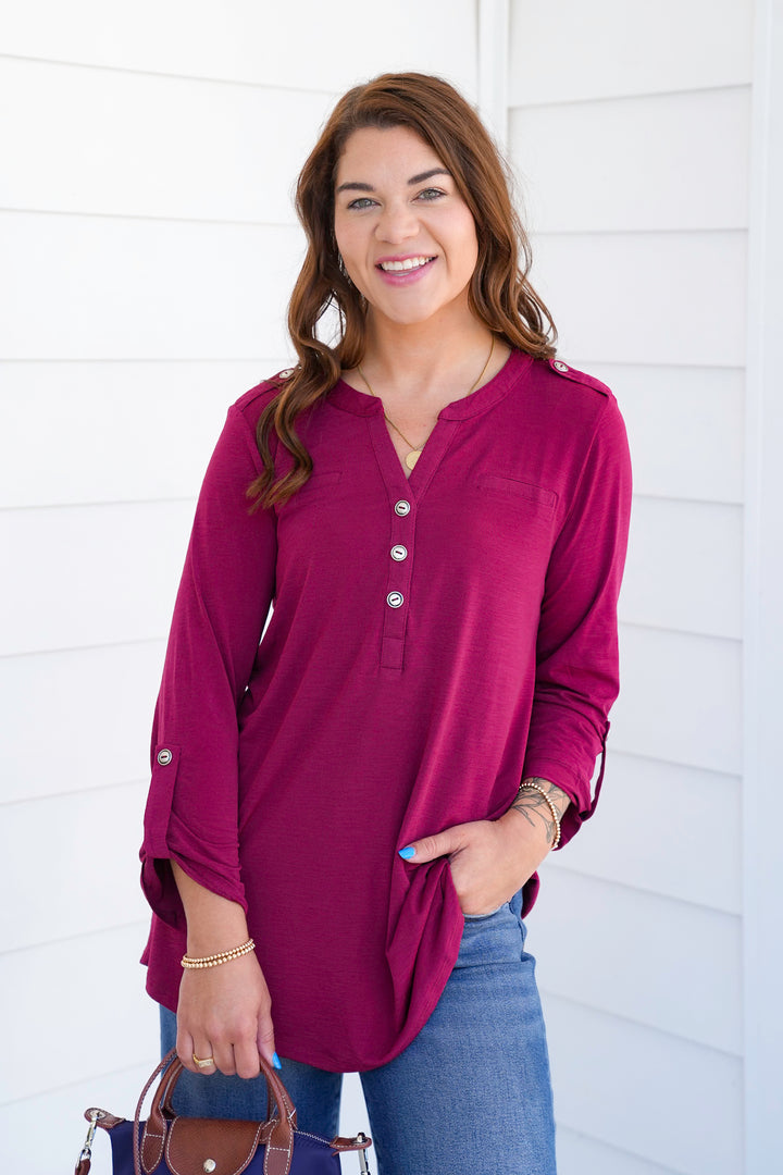 Door Buster! Plus/Reg Solid 3/4 Sleeve Button Up Tunic Top