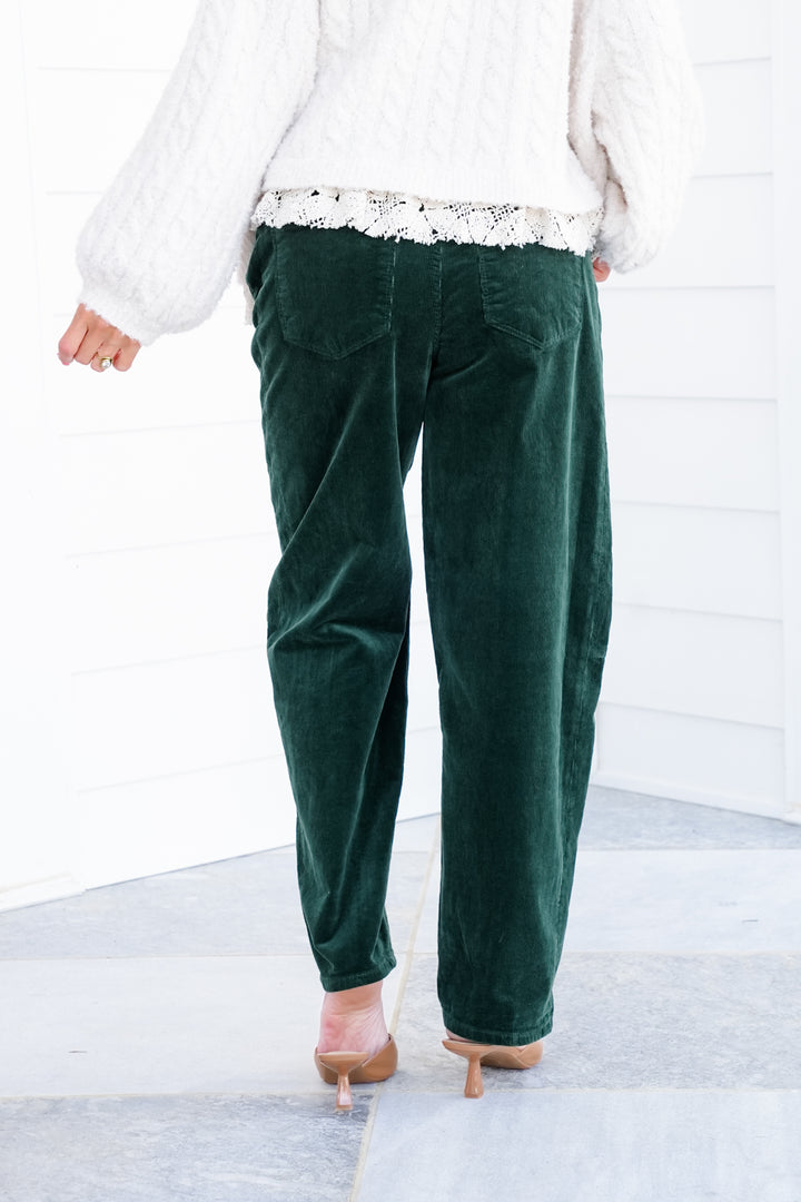 Risen High Rise Green Cuffed Corduroy Barrel Pants