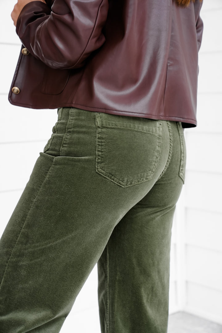 Risen High Rise Green Wide Leg Corduroy Pants with Patch Pockets