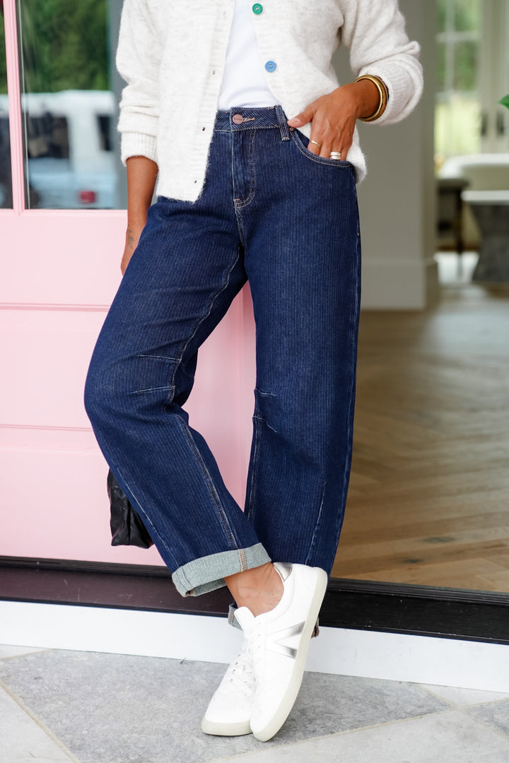 Risen Sunday Market High Rise Dark Wash Textured Barrel Jeans