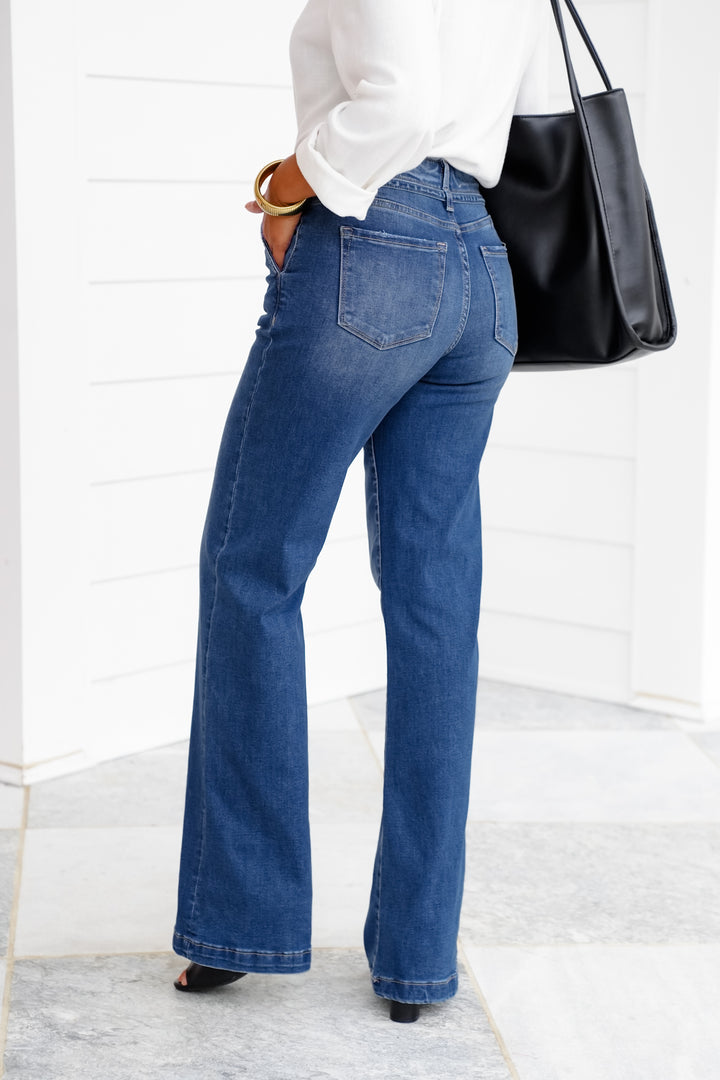 Risen High Rise Dark Wash Wide Leg Flare Jeans with Patch Pockets